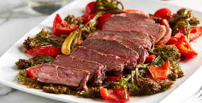 This top sirloin recipe is a complete dinner in just 20 minutes! Many veggies can be added or sub for the ones in the recipe, as long as they will be cooked to your liking after 10-12 minutes in a high-temp oven. You will find grass-fed steak, onions, and sweet red peppers at the market this week!