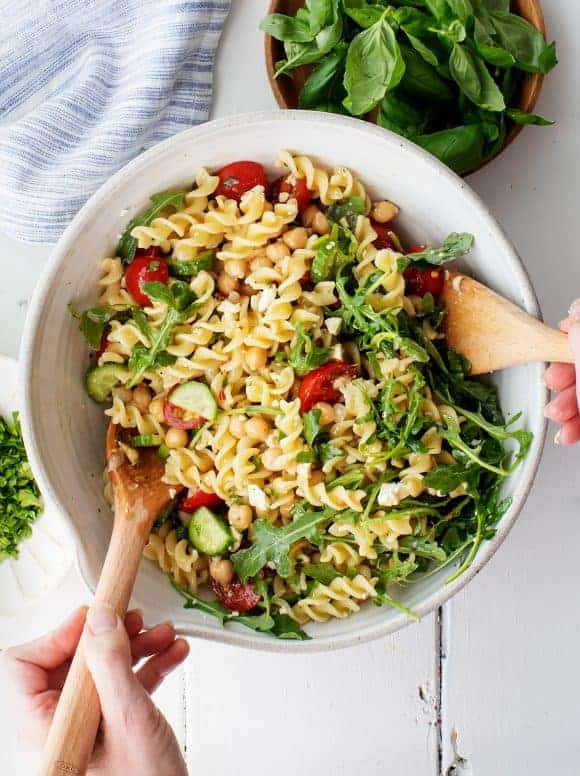 Drain the pasta, toss it with a little olive oil (so that it doesn’t stick together) and let it cool to room temp. Transfer to a large bowl with the tomatoes, chickpeas, arugula, cucumbers, feta cheese, basil, parsley, mint, and pine nuts. Pour the dressing and toss to coat.